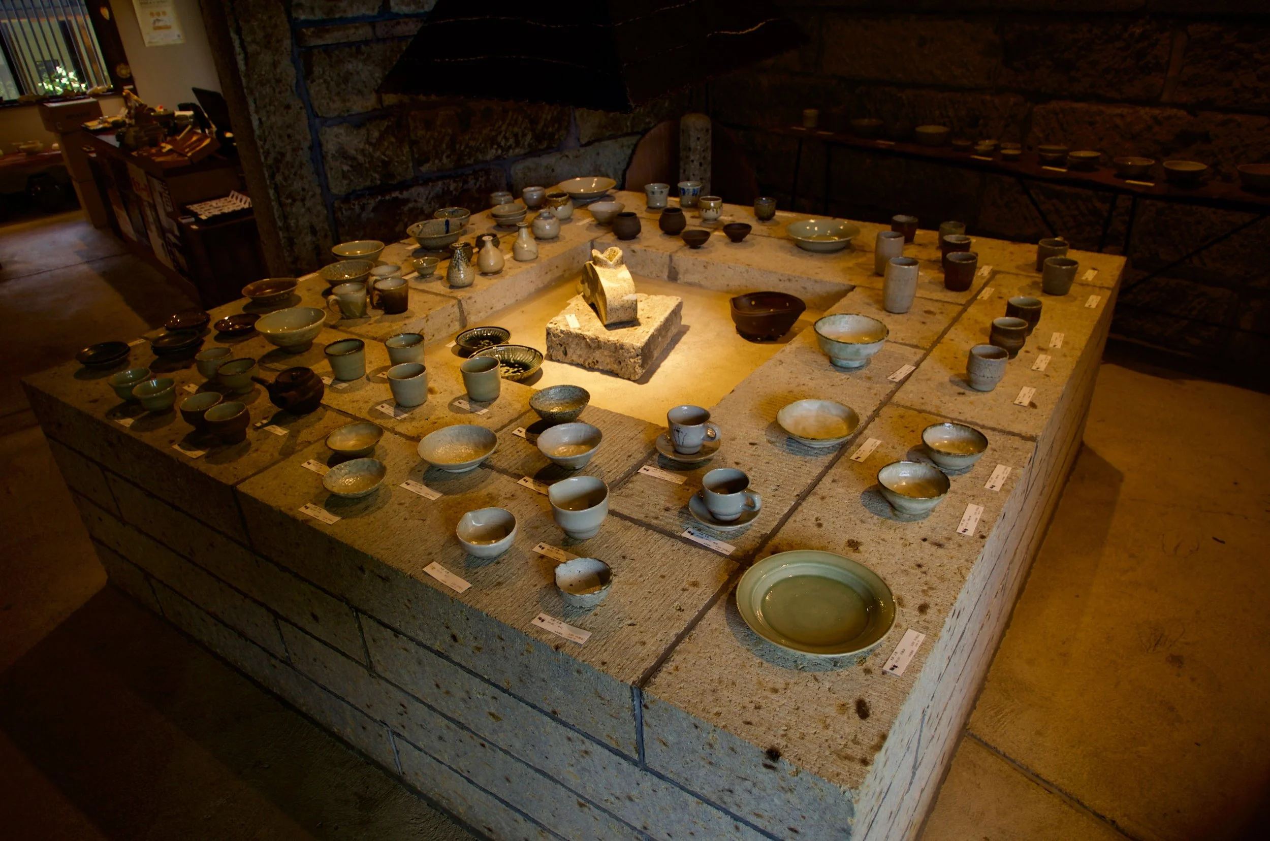 大きな囲炉裏のような大谷石の展示台に並ぶうつわ達は、食卓に並ぶうつわを連想させます。